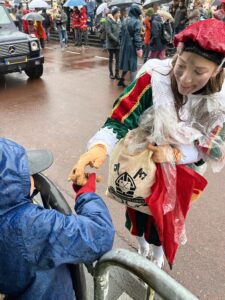 従者であるピート達が沿道にいる子供達にペーパーノートをむき出しで配ります