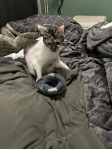 セナのお股が禿げてきてた件、タオルで作った簡易エリザベスカラーつけてましたが時々自力で外すし、別の所を舐めてハゲ作ってきてたのでやめました